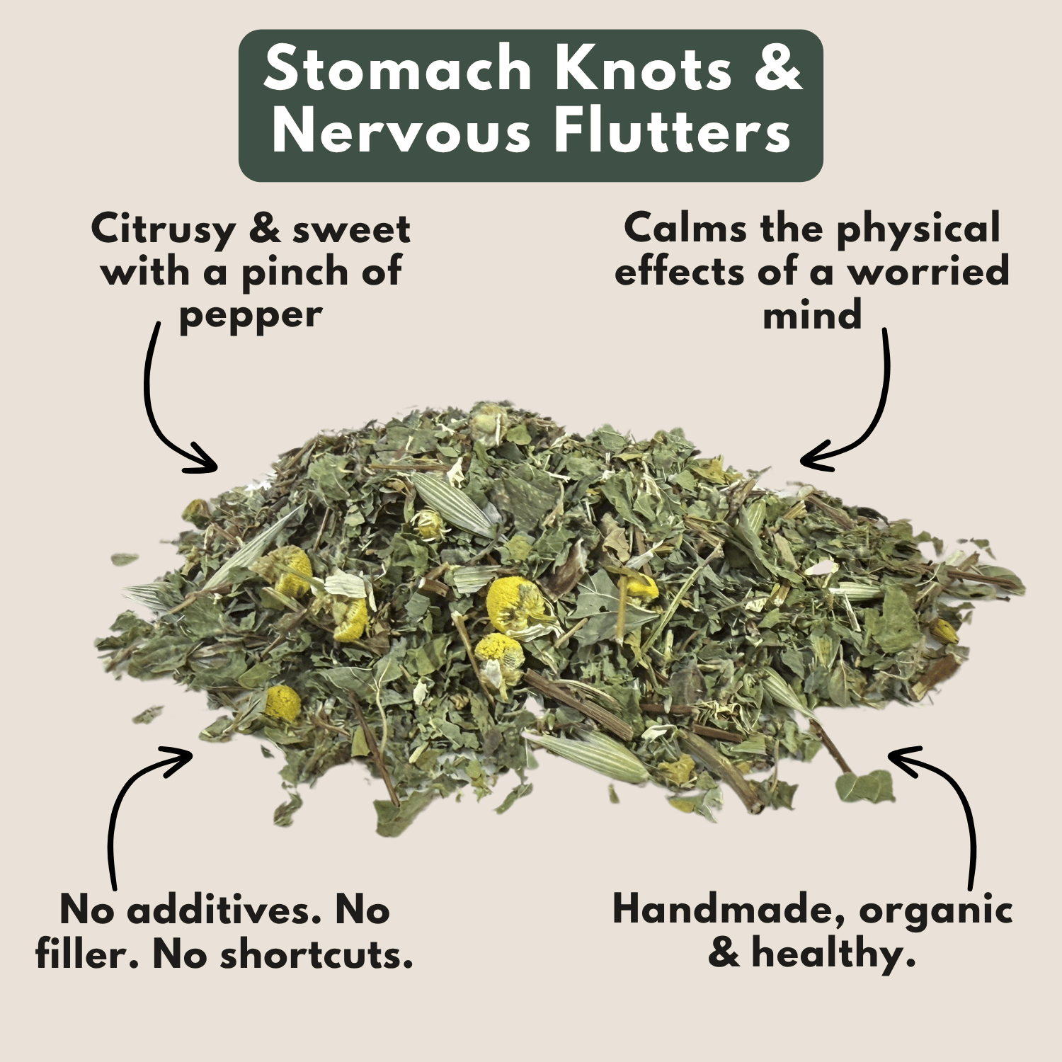 The heart of this blend is a calming trio of Lemon Balm, Chamomile, and Skullcap. These classic nervine herbs are renowned for their ability to soothe an overactive nervous system. They work to ease the mental tension that causes that 'stomach in knots' feeling, while Chamomile's antispasmodic properties specifically help to relax the gut and relieve anxious flutters.