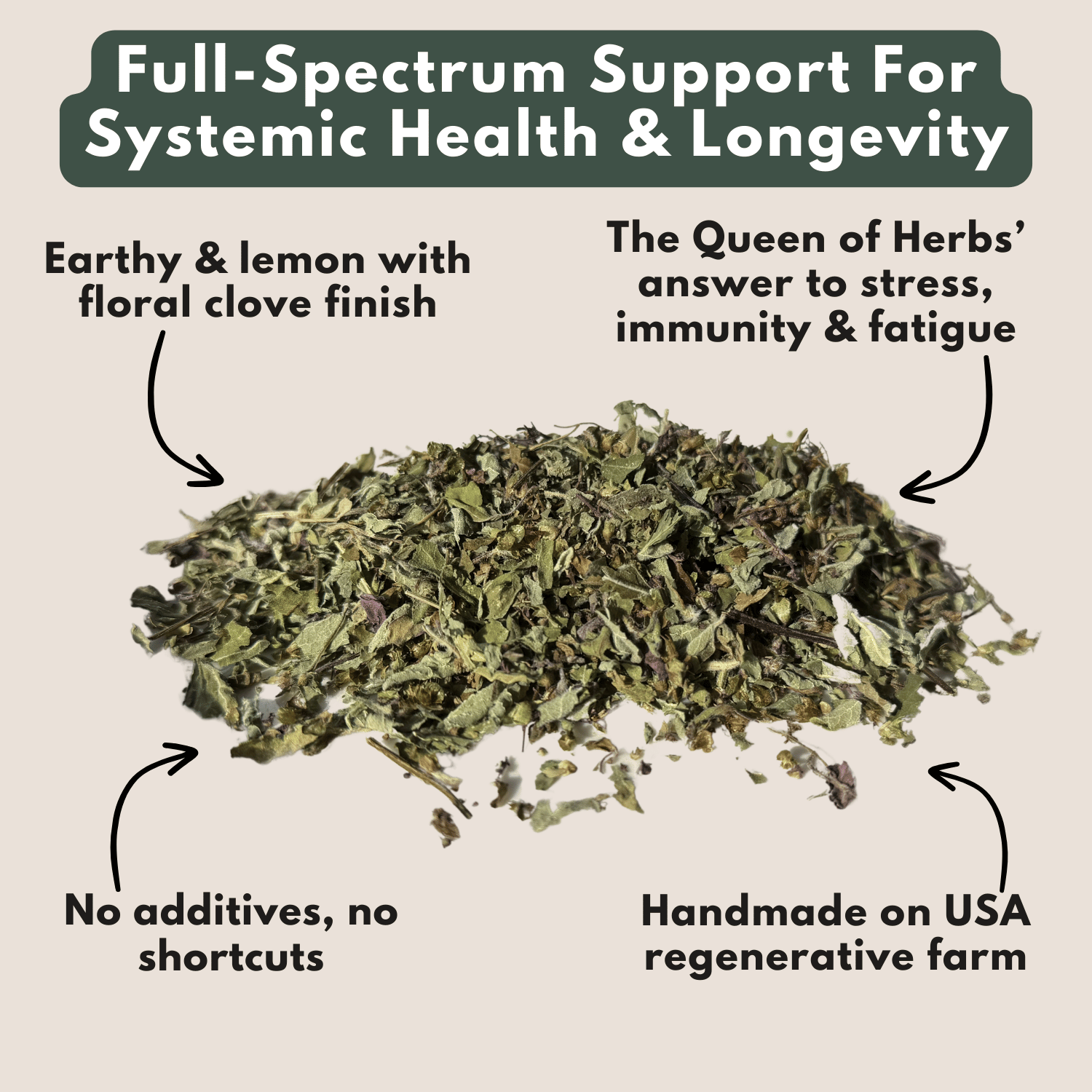 It opens with the aromatic, peppery warmth of Tulsi, grounded immediately by the savory, mineral-rich notes of Nettle. Borage ties it together with a subtle, cooling cucumber-like finish.