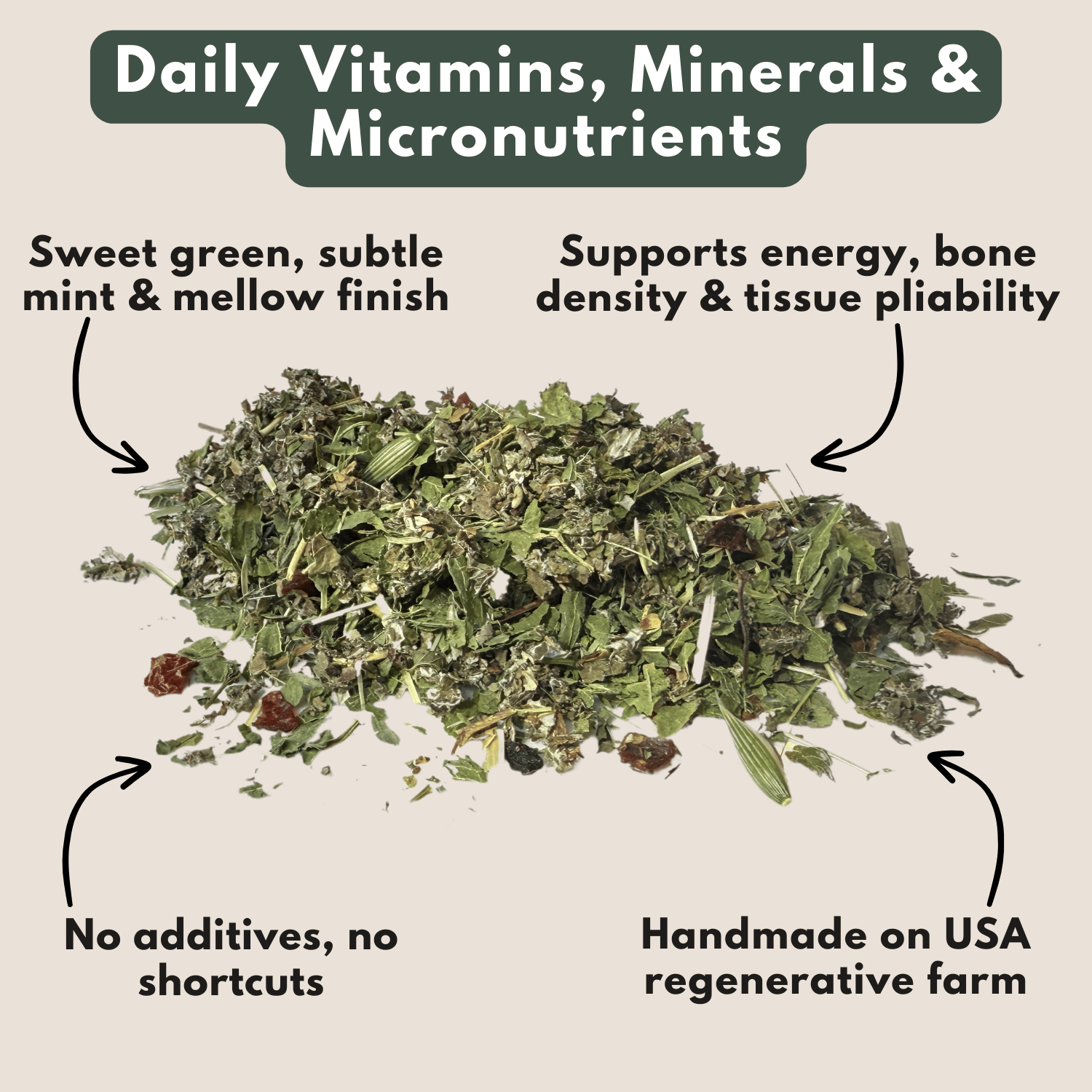 Paired with the nutrient density of Alfalfa, Nettle, and Raspberry Leaf, it provides a massive infusion of bio-available calcium, magnesium & silica to protect bone density and help you feel physically sturdy.
